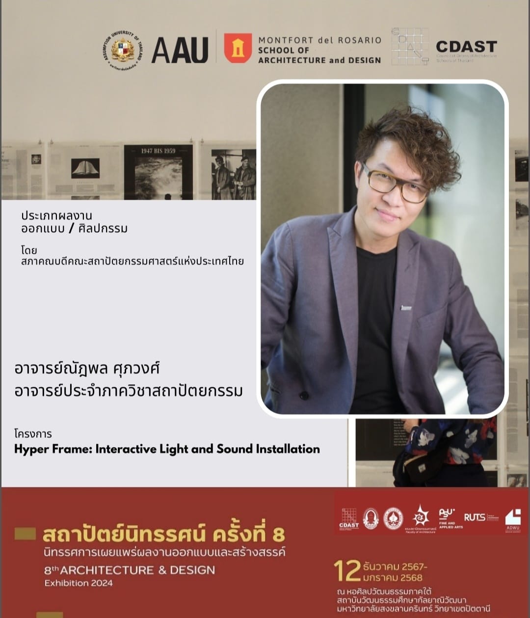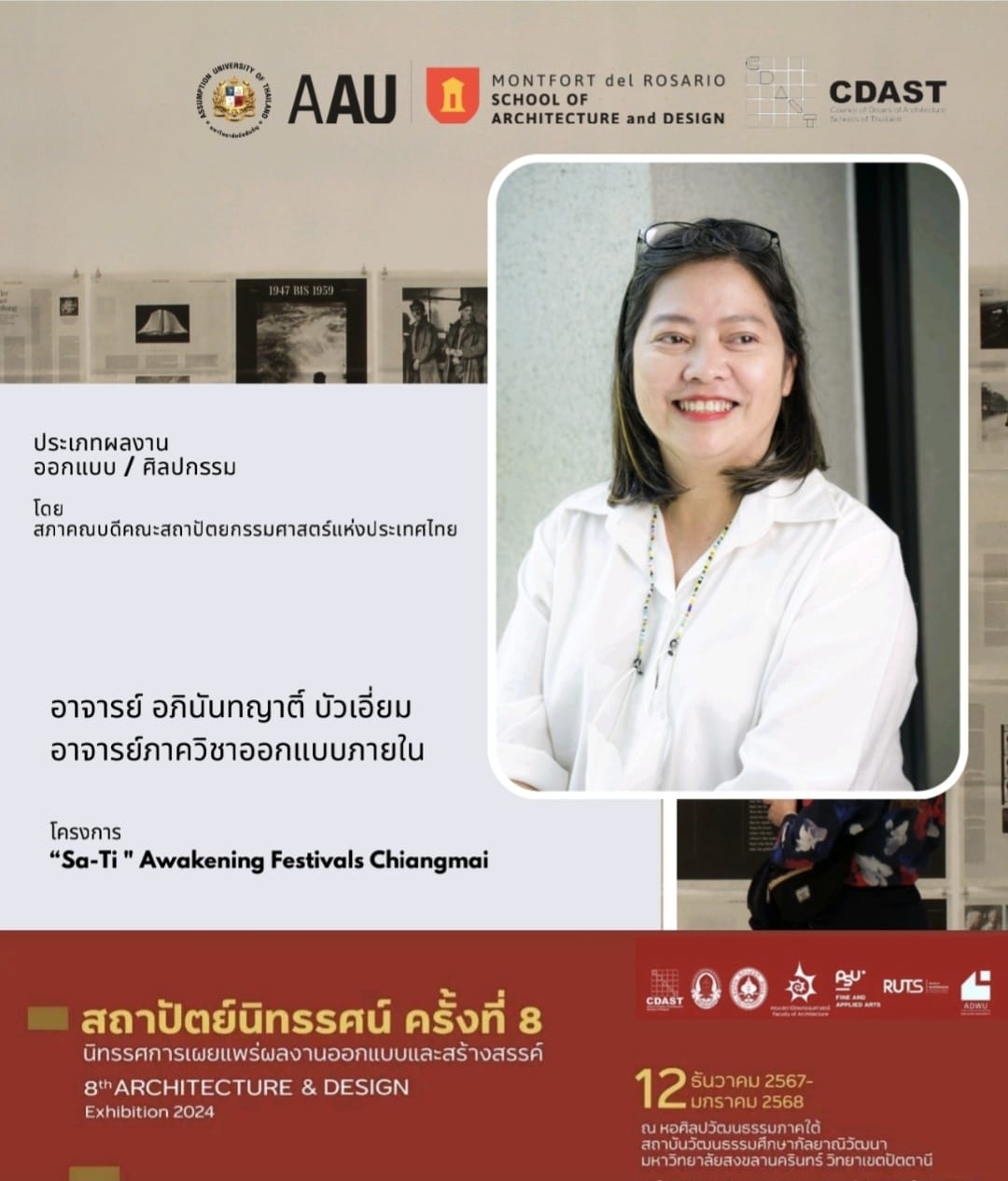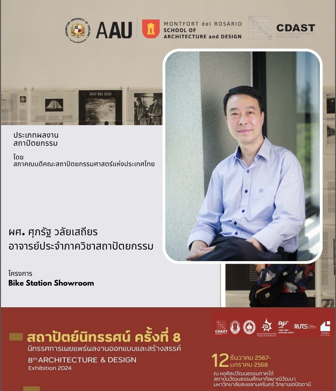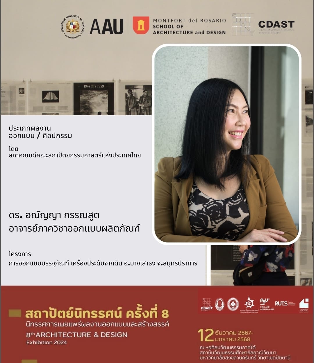 On December 12, 2024, the opening ceremony of the 8th Architecture & Design Exhibition 2024, organized by the Council of Deans of Architecture Schools of Thailand (CDAST), took place at the Southern Art and Culture Center, Prince of Songkla University, Pattani Campus. The exhibition runs until January 12, 2025, and highlights outstanding architectural and design works from across the country.