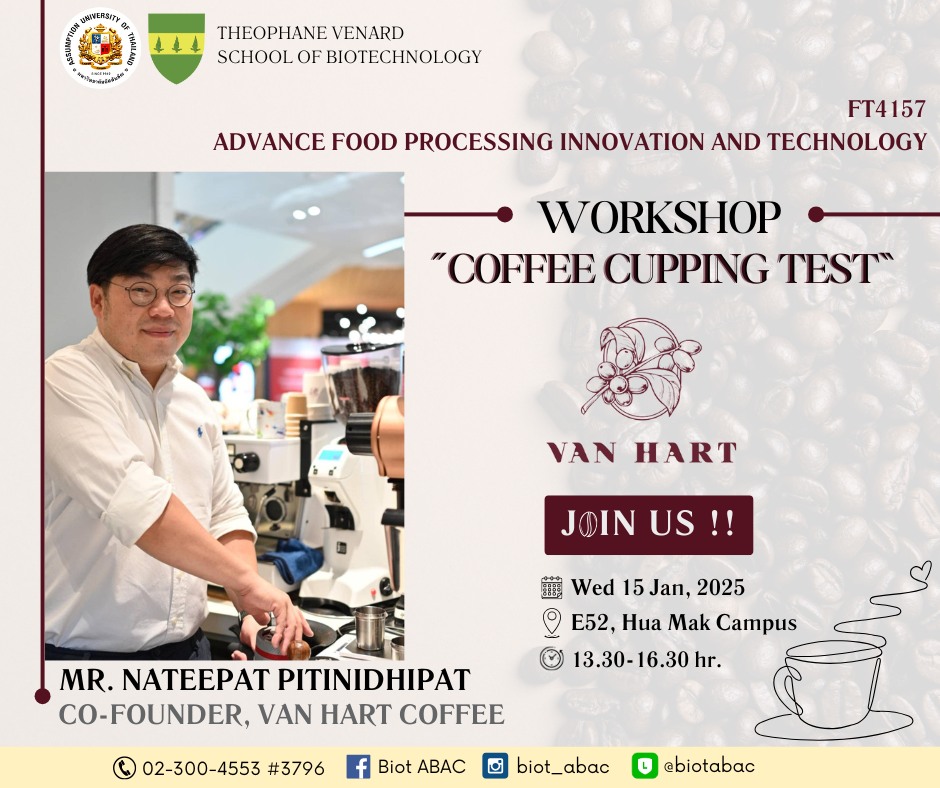 Activities in Academic Year 2024 featured several highlights, including a special lecture by Ms. Thanatcha Janngam, Brand Ambassador and Chef R&D at Eric Kayser Thailand Co., Ltd., who spoke on “The Journey of a Global Food Scientist.” Other distinguished alumni included Ms. Phatthranit Rungsitsathien, QFS & Regulatory Affairs Manager at SPF DIANA (Thailand) Co., Ltd., who shared insights on “What is Palatability for Pet Food,” Ms. Patteera Chanapongpisan, International Product and Business Development Manager at REVOMED GROUP Co., Ltd., who presented “Global Trends in Functional Food Supplements & Cosmetics. and Mr. Nateepat Pitinidhipat, Co-Founder of Van Hart Coffee, who conducted a hands-on workshop on the “Coffee Cupping Test.”
