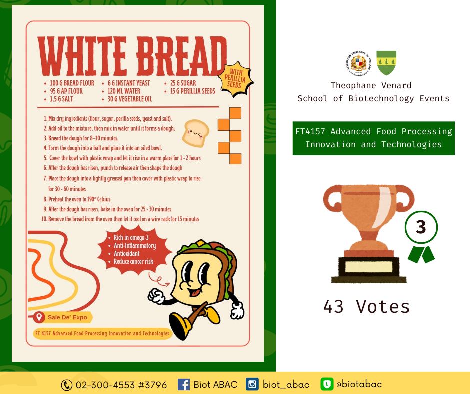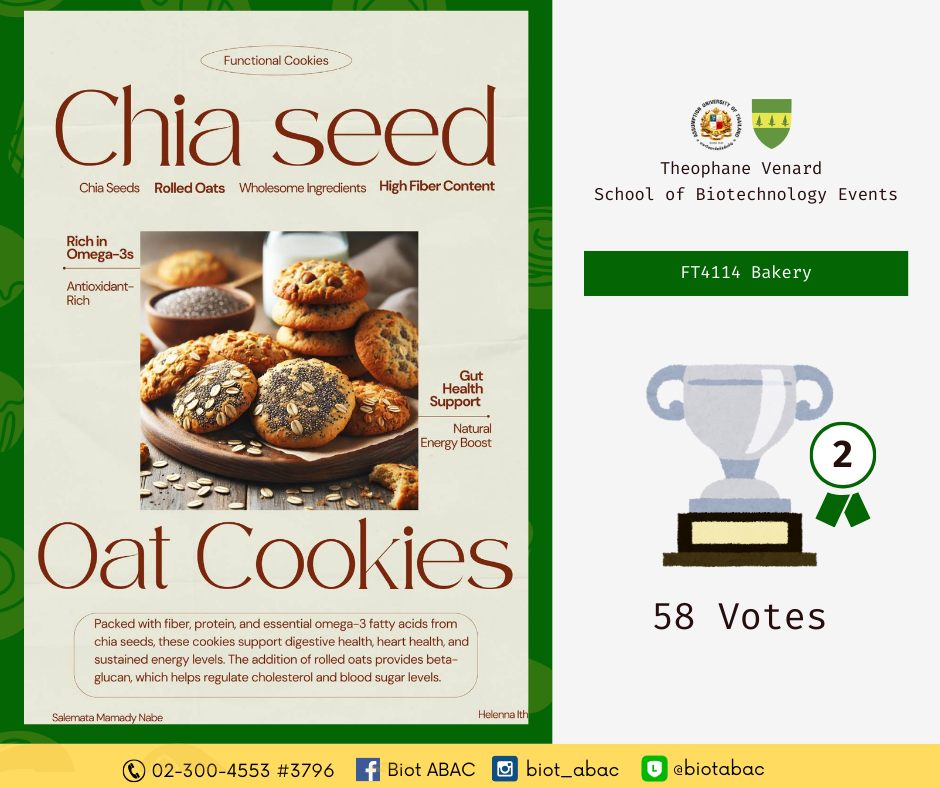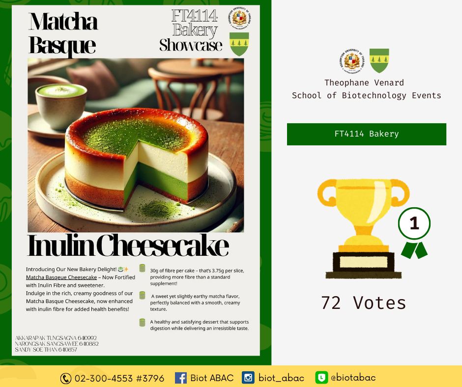 Congratulations to the winners of the Popular Vote: 1. Inulin Cheesecake (FT4114 Bakery) – 72 votes 2. Oat Cookies (FT4114 Bakery) – 58 votes 3. Perilla Seed White Bread (FT4157 Advanced Food Processing Innovation and Technologies) – 43 votes